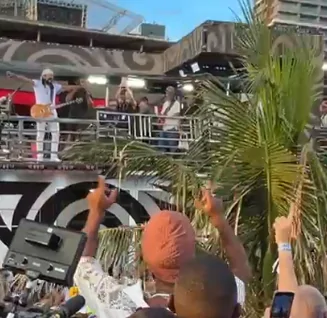 Na sequência, Bell Marques iniciou os acordes de “Selva Branca”, dedicando a apresentação a Carlinhos Brown. A execução foi acompanhada pelos foliões e pelo público presente no camarote, marcando um dos momentos de destaque do desfile do bloco Vumbora neste Carnaval.