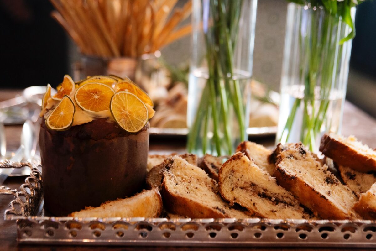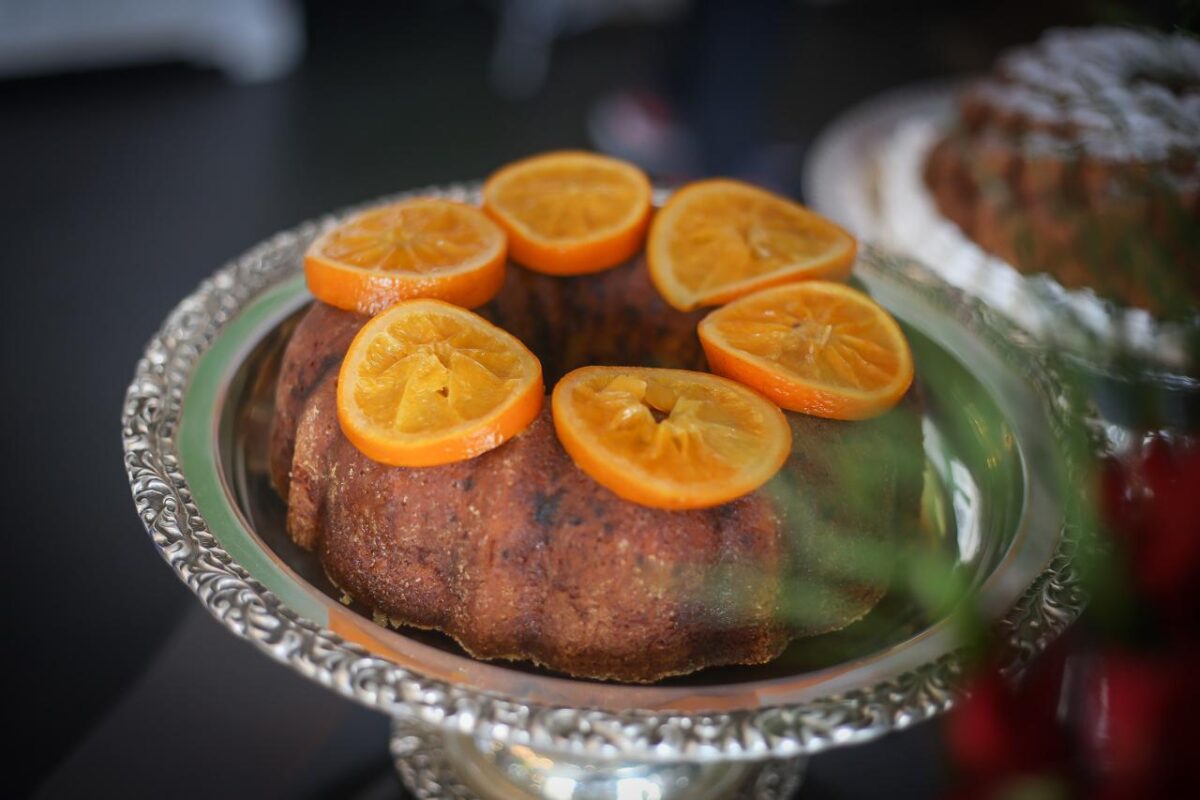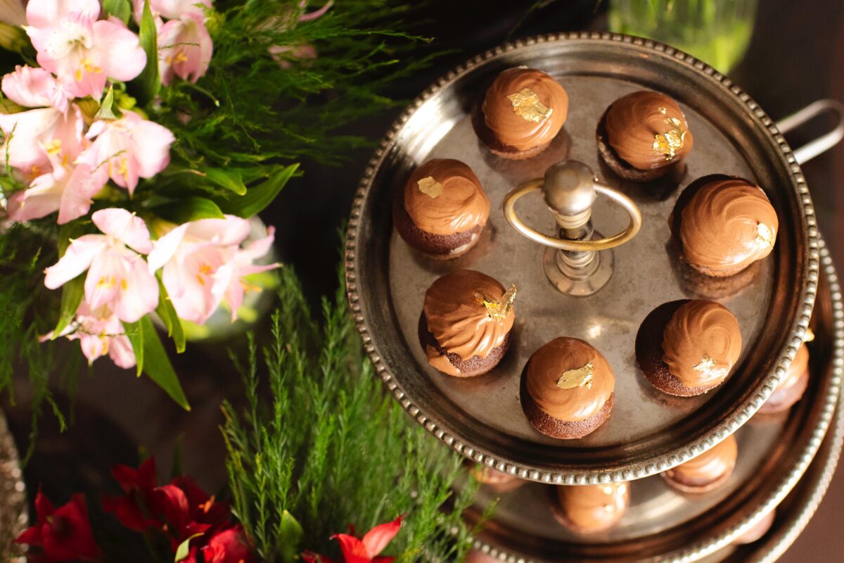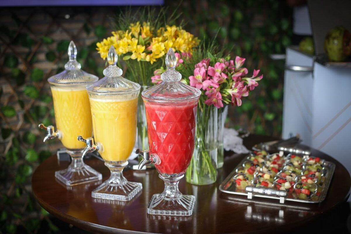 O buffet reúne uma seleção refinada de bolos e preparações artesanais, como bolo de laranja navelina, bolo de limão com brigadeiro de capim-limão, cuca alemã de chocolate com canela, caramelo salgado com pralinée de nozes e versões criativas como o mini bolinho fit de banana, receita do Trapichinho, além do rabatone com caramelo. A mesa de frutas e verrines traz combinações leves e elegantes, como abacaxi com hortelã e limão, uva com romã e mel e mousse de coco com manga, acompanhadas de sucos naturais.
