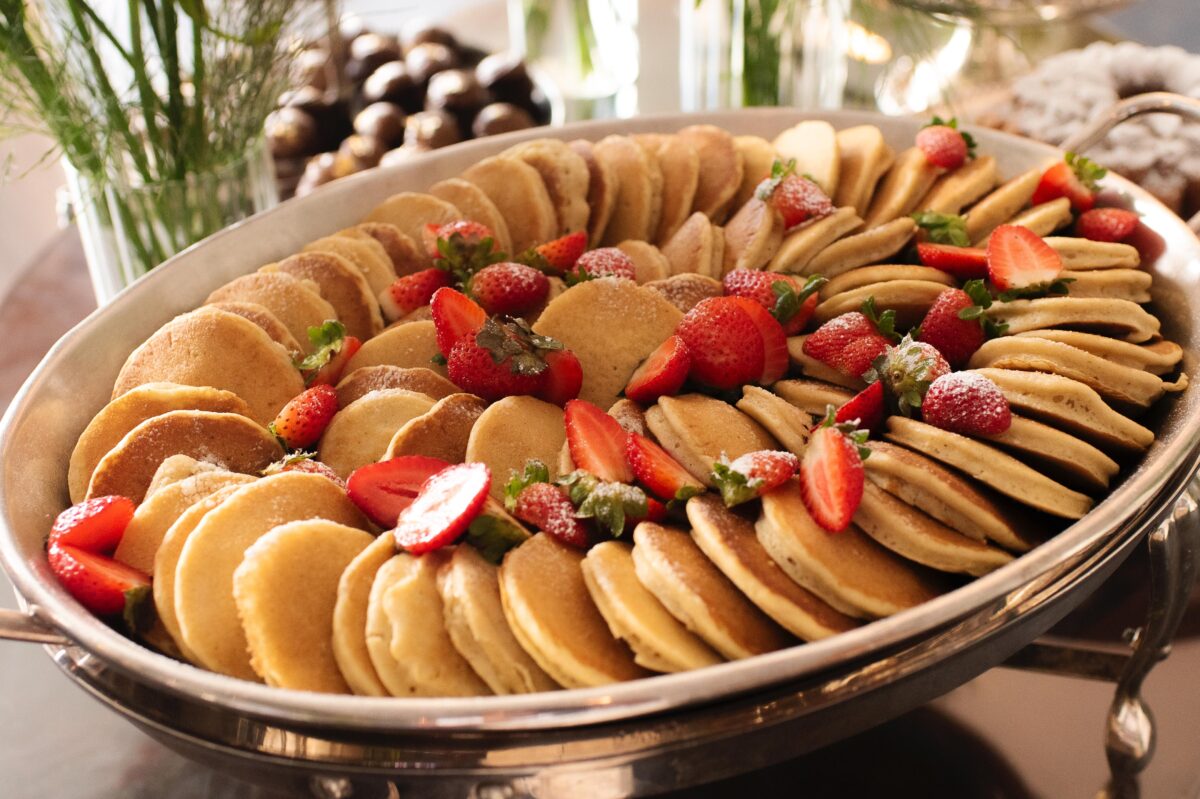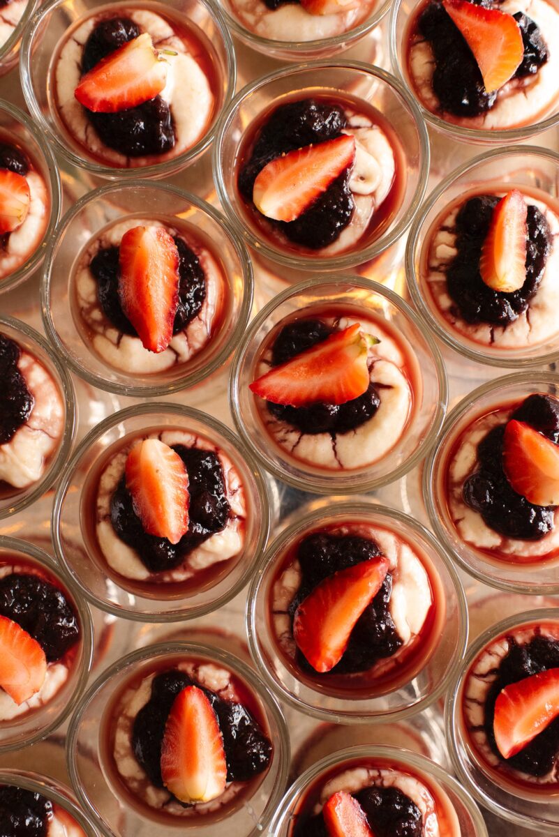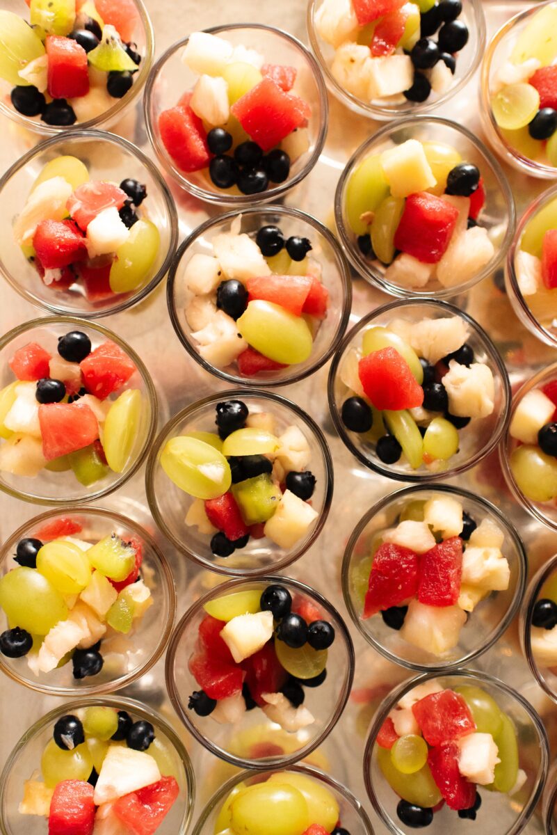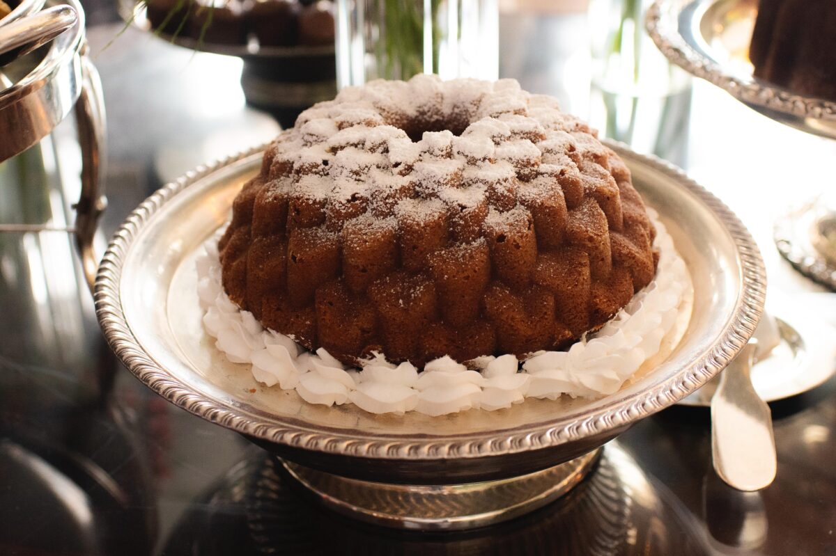 O buffet reúne uma seleção refinada de bolos e preparações artesanais, como bolo de laranja navelina, bolo de limão com brigadeiro de capim-limão, cuca alemã de chocolate com canela, caramelo salgado com pralinée de nozes e versões criativas como o mini bolinho fit de banana, receita do Trapichinho, além do rabatone com caramelo. A mesa de frutas e verrines traz combinações leves e elegantes, como abacaxi com hortelã e limão, uva com romã e mel e mousse de coco com manga, acompanhadas de sucos naturais.