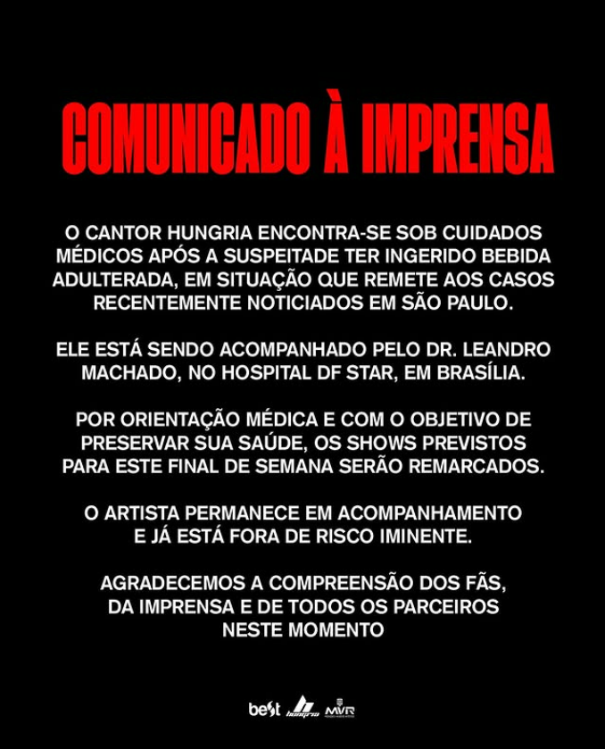 A equipe médica iniciou tratamento especializado e informou que o quadro segue em investigação. A assessoria do artista comunicou, no início da tarde, que ele está fora de risco iminente. Não foi informado onde Hungria teria consumido a bebida suspeita.