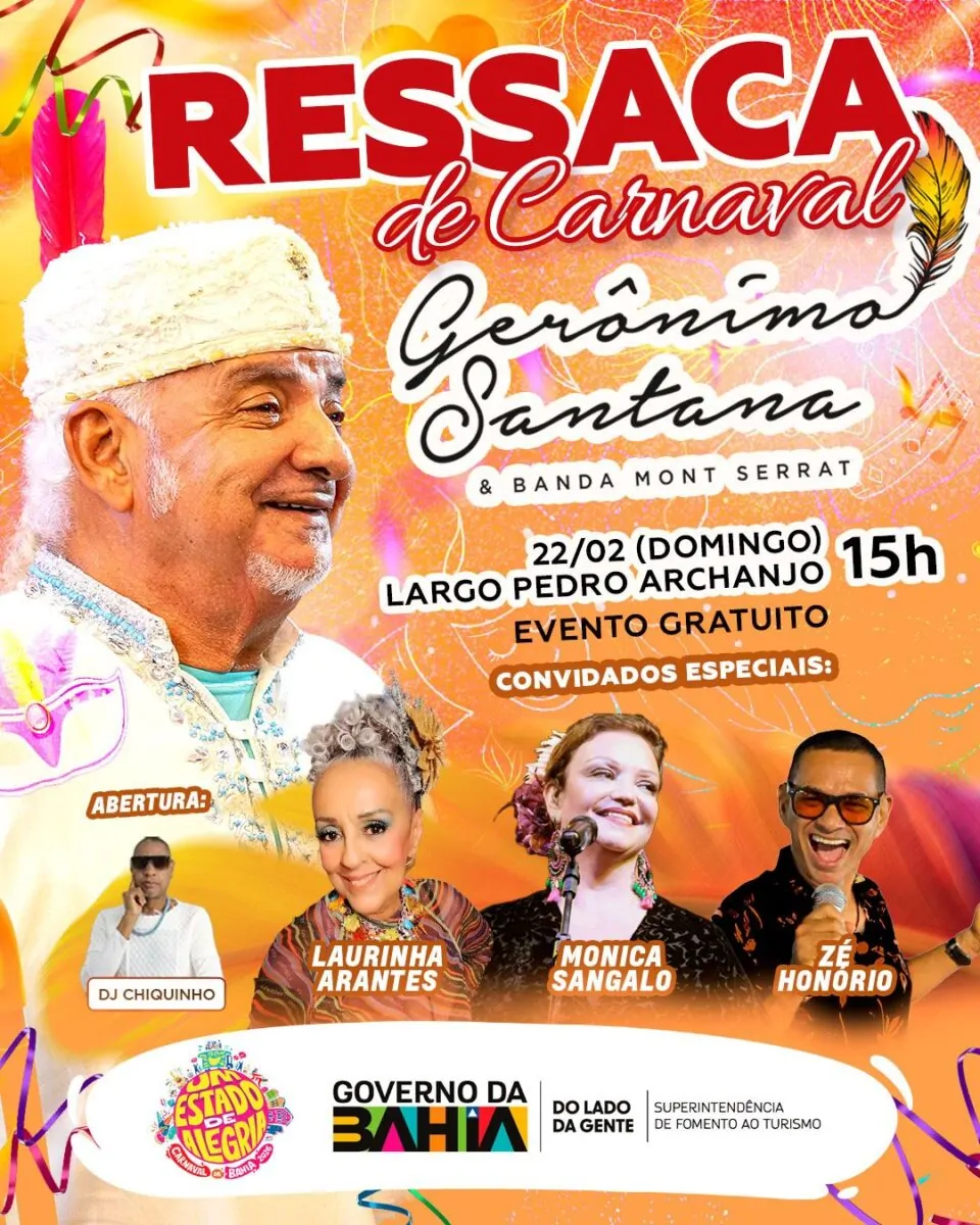 A tradicional Ressaca de Carnaval de Gerônimo Santana volta a movimentar o Largo Pedro Arcanjo, no Pelourinho, neste domingo (22), em Salvador. Nesta edição, o artista recebe convidados como Laurinha Arantes, Mônica Sangalo e Zé Honório, além de outras participações especiais que ampliam o caráter coletivo e festivo do evento
