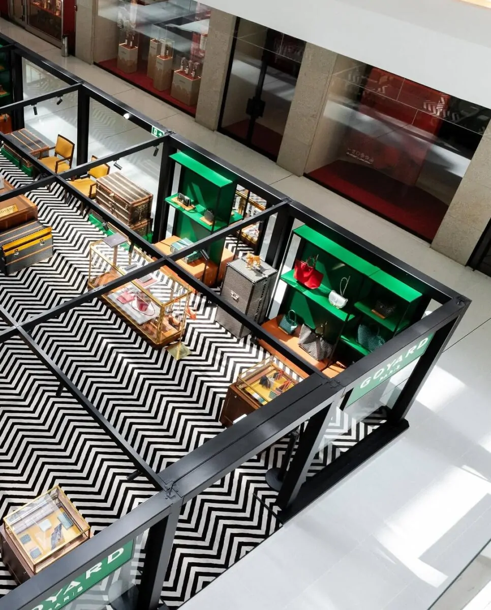 Desenvolvido pelo time internacional da maison, o projeto arquitetônico revisita códigos históricos da Goyard em uma leitura contemporânea. O ambiente traz mobiliário em mogno, piso chevron em preto e branco e o tradicional Verde Goyard, em referência à primeira flagship da marca, inaugurada em Paris em 1853.