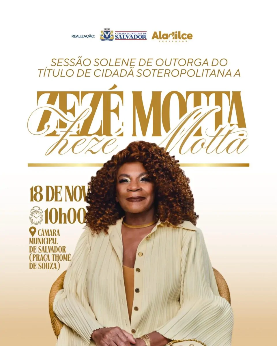 A Câmara Municipal de Salvador concederá o título de Cidadã Soteropolitana à cantora e atriz Zezé Motta no próximo dia 18 de novembro, em cerimônia no Plenário Cosme de Farias. A iniciativa é da vereadora Aladilce Souza (PCdoB), motivada pela forte relação da artista com a cultura baiana. Carioca de Campos dos Goytacazes, Zezé é frequentemente associada ao estado pela atuação em movimentos culturais locais.